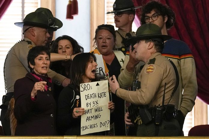 People in the gallery of the House chamber are removed by state troopers after a bill allowing some teachers to be armed in schools passes during a legislative session Tuesday, April 23, 2024, in Nashville, Tenn. (AP Photo/George Walker IV)