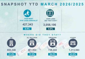 Den luna di maart 2026, Aruba a ricibi un total di 156.773 bishitante stayover, mientras cu e cantidad total di nochinan di estadia a yega 1.030.122. Esaki a resulta den un promedio di estadia (Average Length of Stay – ALOS) di 6,6 anochi, cu ta refleha un mescla consistente di duracion di estadia y tipo di biahe durante e luna.