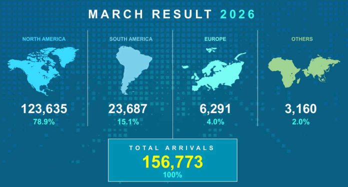 E distribucion di mercado durante maart a mustra cu Norte America a sigui ta e region cu e mayor aporte, representando 78,9% di tur bishitante. Sur America a contribui cu 15,1%, Europa cu 4,0%, mientras cu otro regionnan a representa 2,0% di total di yegadanan. Estados Unidos y Canada a sigui a contribui na mas yegadanan for di Norte America, mientras cu Argentina a mantene un rol fuerte dentro di Sur America. Pa Europa, Hulanda a sigui ta e mercado cu mas yegadanan, sigui pa otro paisnan Europeo.