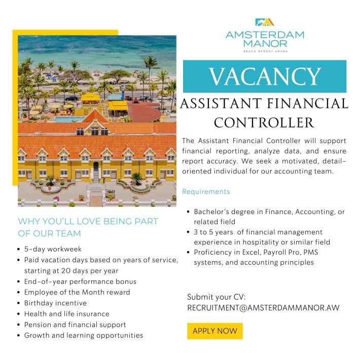 Home VACATURA Amsterdam Manor – Assistant Financial Controller VACATURA Amsterdam Manor – Assistant Financial Controller March 30, 2026 5 Facebook Twitter Google+ Pinterest WhatsApp Ultimo Noticianan Hospice Atardi – Enfermero(a) Niv 3/Niv 4... March 30, 2026 Aruba Beach Club Resort – Human Resources... March 30, 2026 Het Schakel College – Enrollments for School... March 30, 2026
