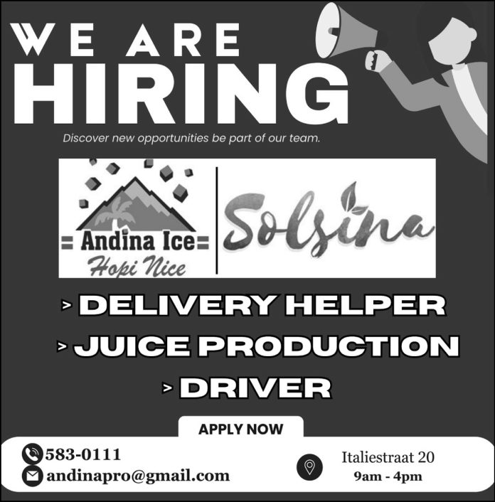 Home VACATURA Andina Ice – Delivery Helper, Juice Production, Driver VACATURA Andina Ice – Delivery Helper, Juice Production, Driver January 14, 2026 8 Facebook Twitter Google+ Pinterest WhatsApp Andina Hiring(2) Ultimo Noticianan Aruba Beach Club Resort – Various Job... January 14, 2026 Andina Ice – Delivery Helper, Juice Production,... January 14, 2026 Casonan di alcohol so den prome zitting... January 13, 2026