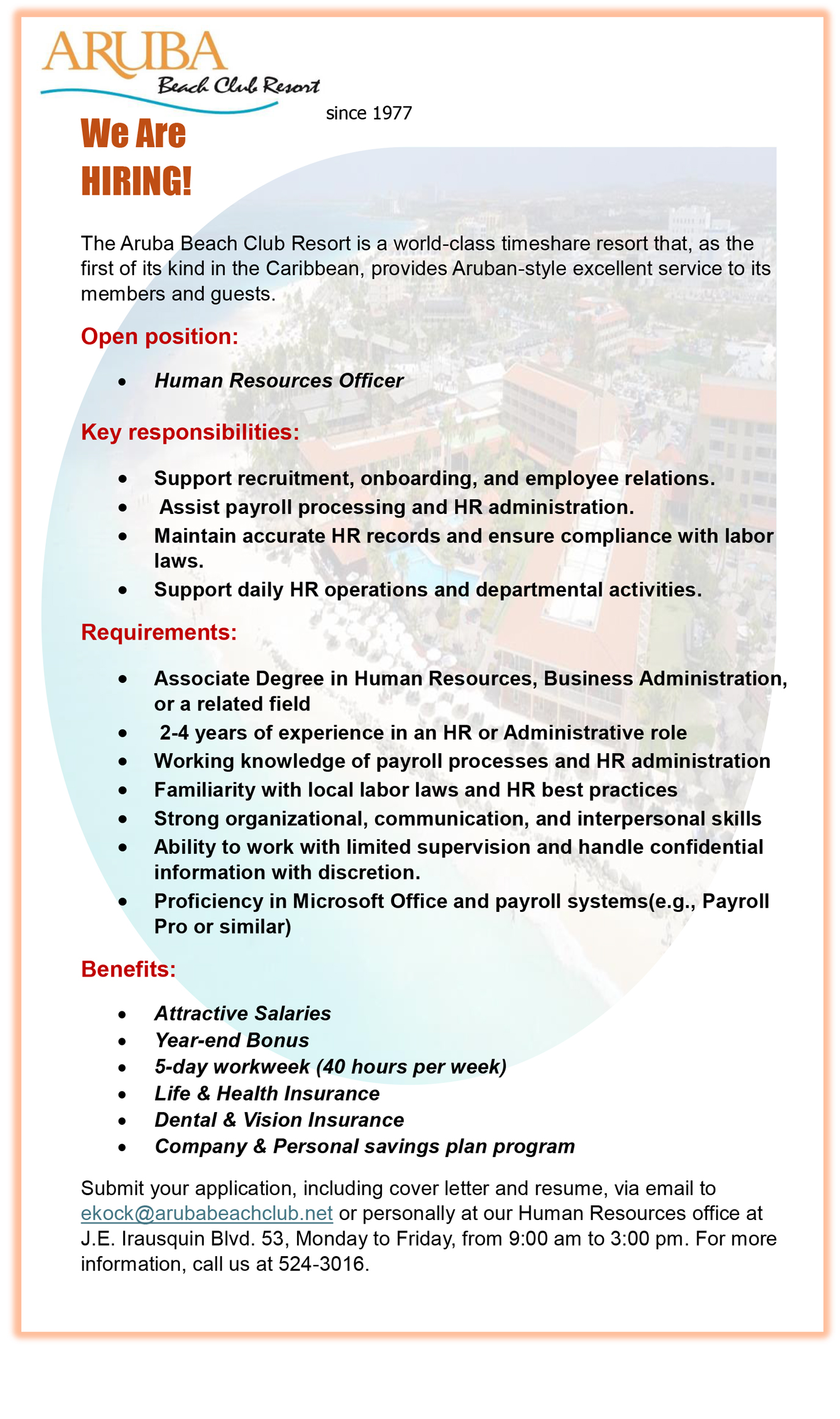 Home VACATURA Aruba Beach Club Resort – Human Resources Officer VACATURA Aruba Beach Club Resort – Human Resources Officer March 30, 2026 8 Facebook Twitter Google+ Pinterest WhatsApp Ultimo Noticianan Hospice Atardi – Enfermero(a) Niv 3/Niv 4... March 30, 2026 Aruba Beach Club Resort – Human Resources... March 30, 2026 Het Schakel College – Enrollments for School... March 30, 2026