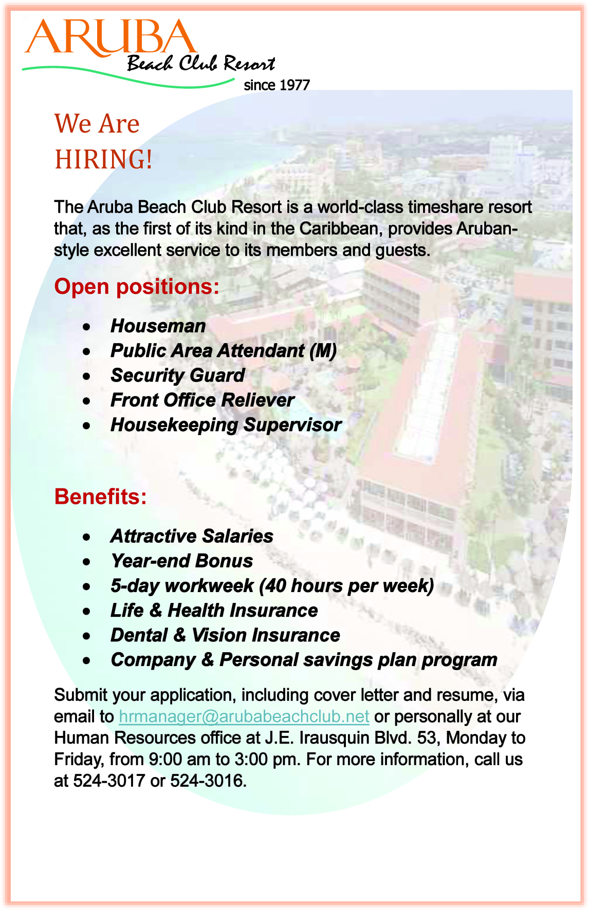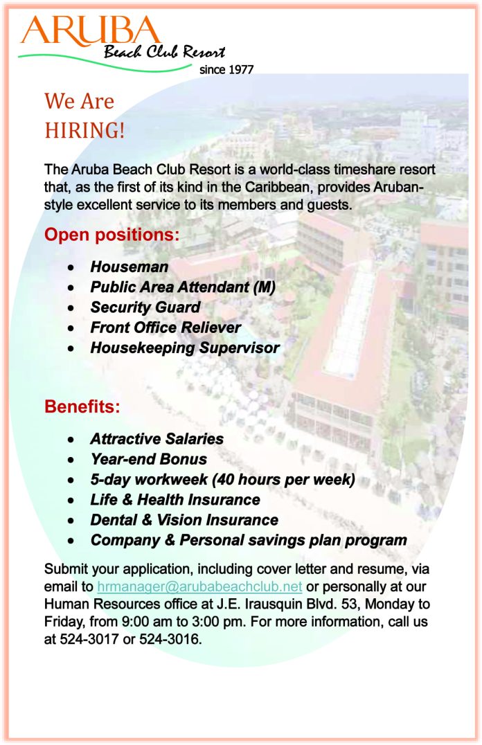 Home VACATURA Aruba Beach Club Resort – Various Job Opportunities VACATURA Aruba Beach Club Resort – Various Job Opportunities January 14, 2026 16 Facebook Twitter Google+ Pinterest WhatsApp Ultimo Noticianan Aruba Beach Club Resort – Various Job... January 14, 2026 Andina Ice – Delivery Helper, Juice Production,... January 14, 2026 Casonan di alcohol so den prome zitting... January 13, 2026