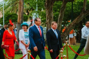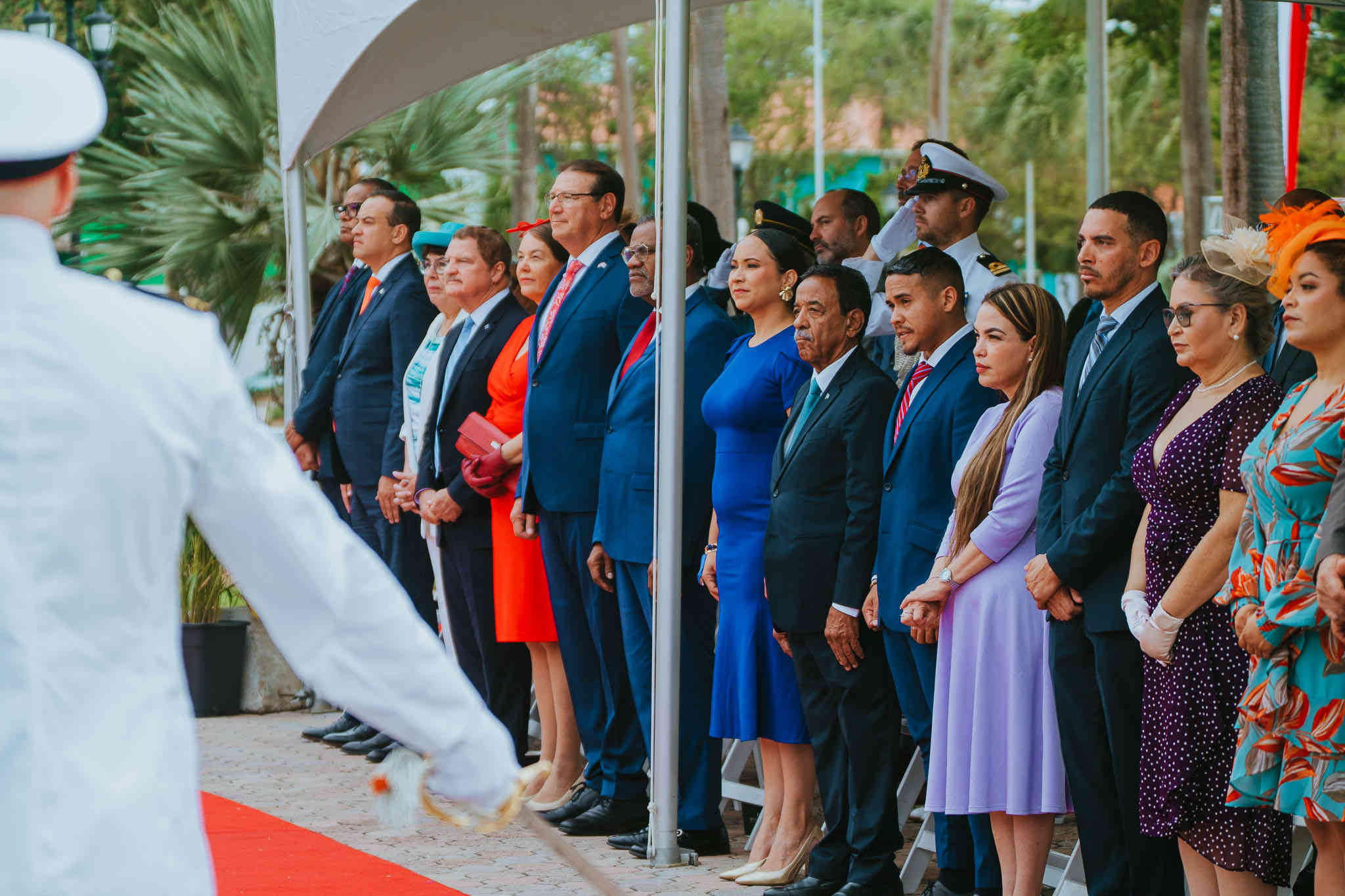 E acto protocolar a cuminsa cu ricibimento oficial di Su Excelencia e Gobernador hunto cu su distinguida esposa, y Prome Minister Mike Eman hunto cu su distinguida esposa, como tambe miembronan di Gabinete, parlamentarionan, representantenan di Hulanda na Aruba y e Corps Consulaire.
