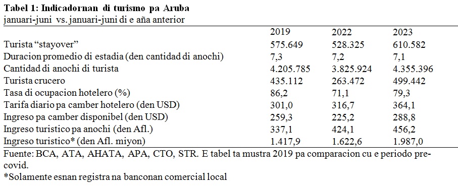 Durante e prome seis luna di 2023, mayoria di e indicadornan turistico a realisa un mehoracion compara cu e mesun periodo di 2022 (Tabel 1). E cantidad di bishitante “stayover” a expande cu 15,6 porciento di januari pa juni 2023 compara cu e mesun periodo den e aña anterior. Sinembargo, e crecemento fuerte den e prome kwartaal di 2023 (+31,3 porciento compara cu e prome kwartaal di 2022) a nivela den e di dos kwartaal di 2023 (+3,3 porciento compara cu e di dos kwartaal di 2022). Na su turno, e industria hotelero a raporta un grado di ocupacion cu a crece te na 79,3 porciento den e prome seis luna di 2023, compara cu 71,1 porciento durante e mesun periodo di 2022. Ademas, e tarifa pa camber a subi significantemente (+15,0 porciento), mientras cu e duracion promedio di estadia a baha di 7,2 anochi pa 7,1 den e prome mita di 2023 compara cu e mesun periodo di 2022. Consecuentemente, entrada pa camber a expande cu 28,2 porciento. Siguiendo e desaroyonan menciona aki riba, entrada turistico a aumenta cu 22,5 porciento den e prome mita di 2023.