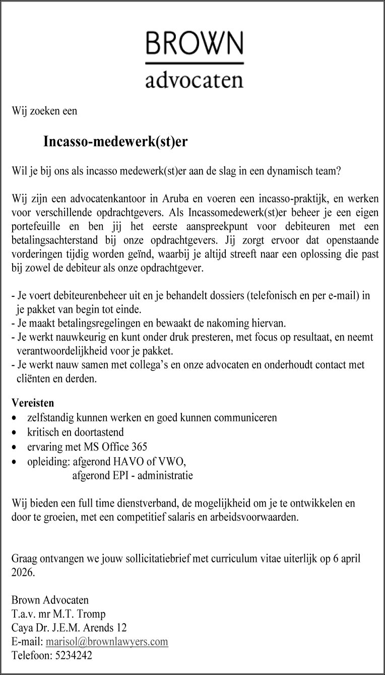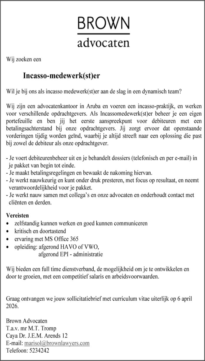 Home VACATURA Brown Advocaten – Incasso-medewerk(st)er VACATURA Brown Advocaten – Incasso-medewerk(st)er March 13, 2026 3 Facebook Twitter Google+ Pinterest WhatsApp Ultimo Noticianan Brown Advocaten – Incasso-medewerk(st)er March 13, 2026 Educacion Profesional Intermedio (EPI) – OLC Instructeur... March 13, 2026 Casa Tua – Chef, Line Cook &... March 13, 2026