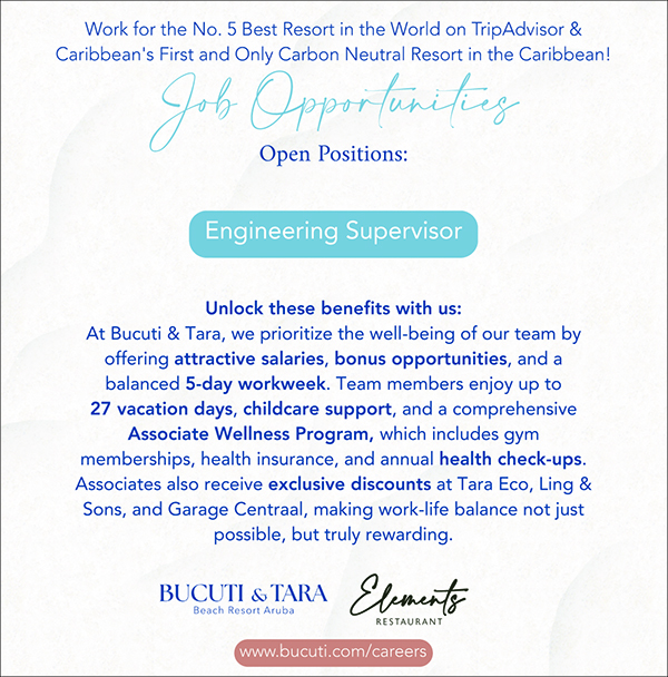 Home VACATURA Bucuti & Tara Beach Resort – Engineering Supervisor VACATURA Bucuti & Tara Beach Resort – Engineering Supervisor January 22, 2026 3 Facebook Twitter Google+ Pinterest WhatsApp Ultimo Noticianan Bucuti & Tara Beach Resort – Engineering... January 22, 2026 Hospice Atardi – Enfermero(a) Niv 3/Niv 4... January 22, 2026 Minister Gerlien Croes ta anuncia restructuracion di... January 21, 2026
