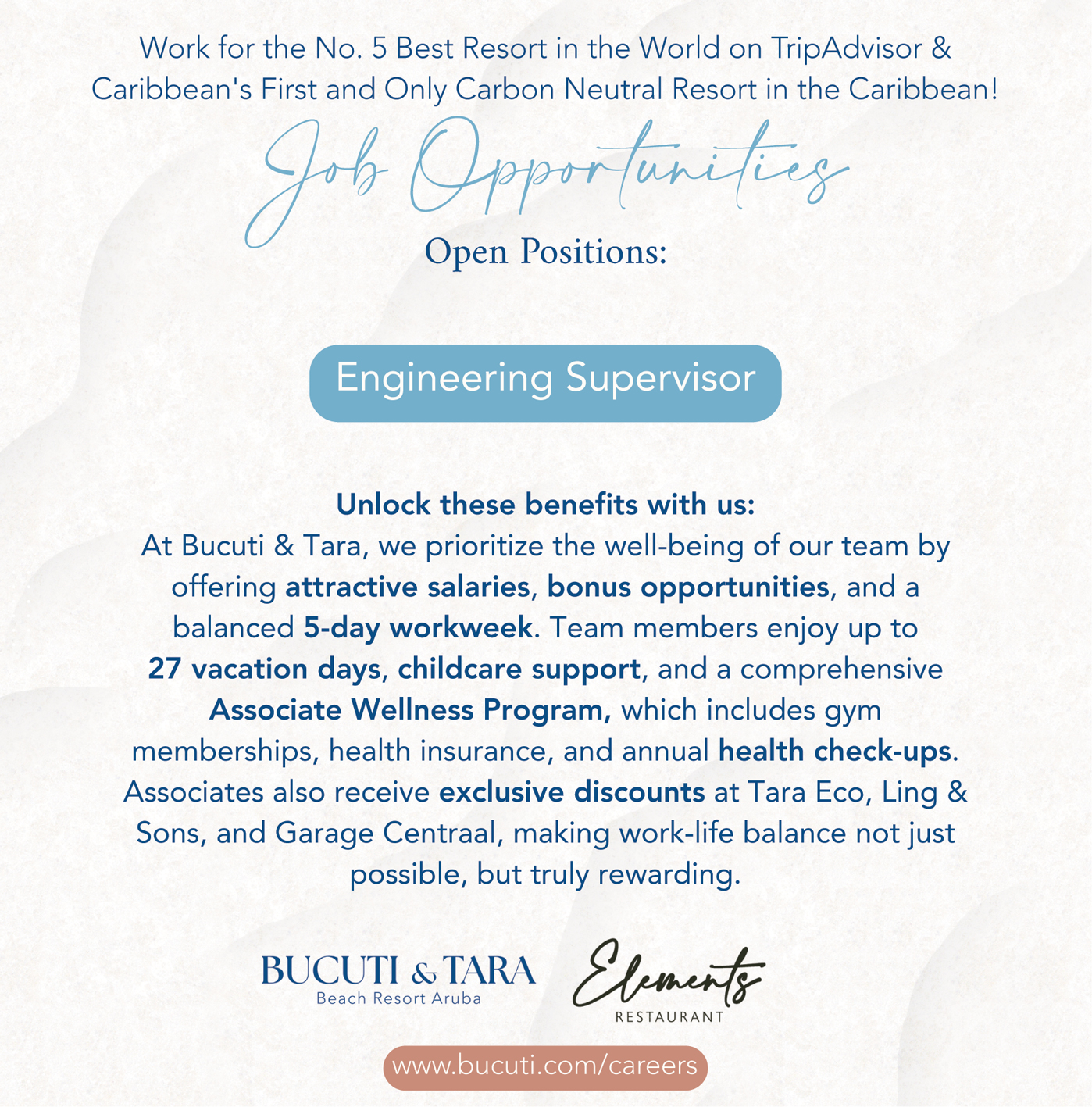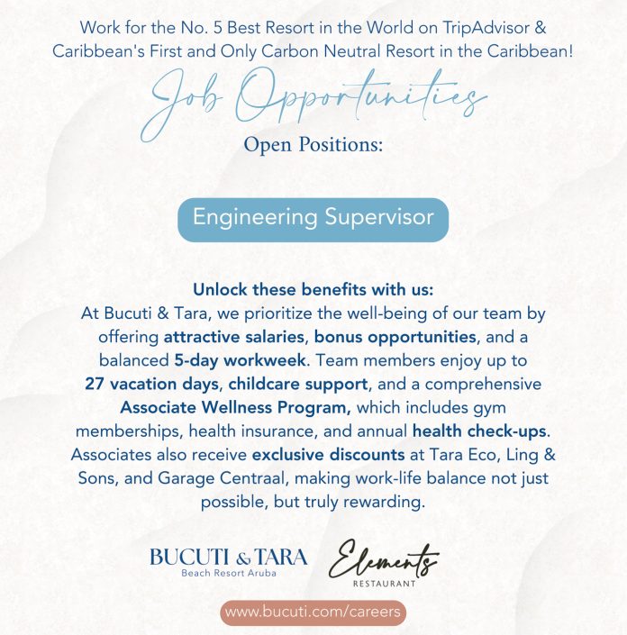 Home VACATURA Bucuti & Tara Beach Resort – Engineering Supervisor VACATURA Bucuti & Tara Beach Resort – Engineering Supervisor April 8, 2026 537 Facebook Twitter Google+ Pinterest WhatsApp Ultimo Noticianan Mundo ta demasiado slow den elimina hepatitis,... April 30, 2026 Diabierna awor Aruba ta celebra Dia di... April 30, 2026 Celebra Dia di Labor na The Birdie... April 29, 2026