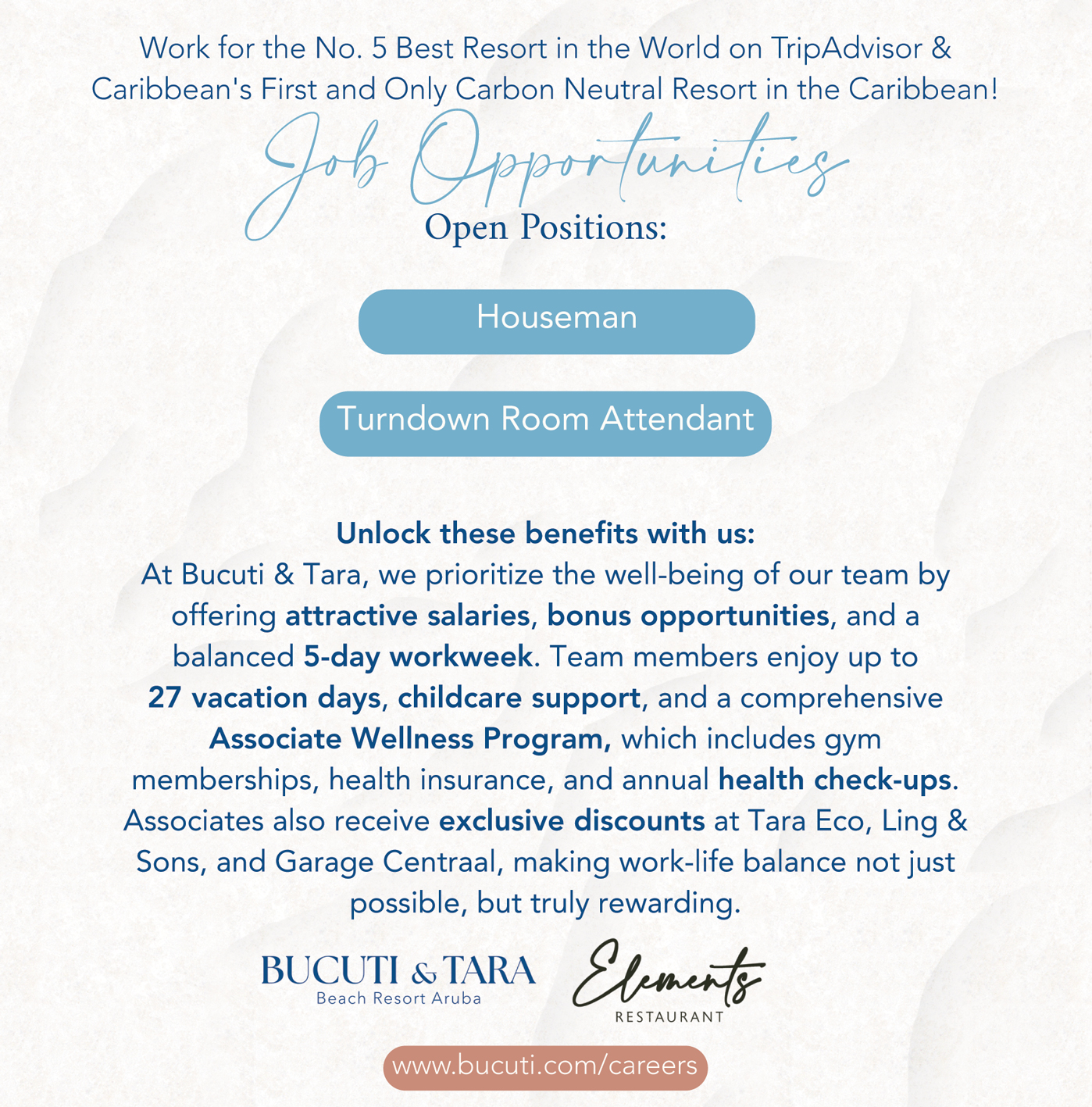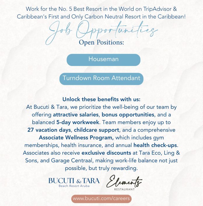 Home VACATURA Bucuti & Tara Beach Resort – Houseman & Turndown Room Attendant VACATURA Bucuti & Tara Beach Resort – Houseman & Turndown Room Attendant March 23, 2026 5 Facebook Twitter Google+ Pinterest WhatsApp Ultimo Noticianan Hospice Atardi – Penningmeester March 23, 2026 Bucuti & Tara Beach Resort – Houseman... March 23, 2026 Alhambra Casino & Shops – Various Job... March 22, 2026