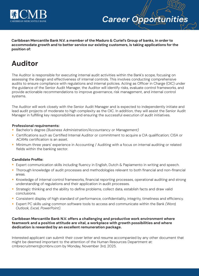 Home VACATURA Caribbean Mercantile Bank (CMB) – Auditor VACATURA Caribbean Mercantile Bank (CMB) – Auditor October 28, 2025 306 Facebook Twitter Google+ Pinterest WhatsApp Ultimo Noticianan 6.690 Mericano a aplica pa muda pa... December 14, 2025 Minister Geoffrey Wever: No lo tin inflacion... December 14, 2025 Aruba y Corsou ta fortalece cooperacion pa... December 14, 2025