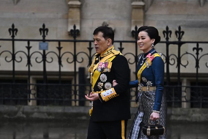 Thailand's King Maha Vajiralongkorn (L) and Thailand's Queen Suthida arrive at Westminster Abbey in central London on May 6, 2023, ahead of the coronations of Britain's King Charles III and Britain's Camilla, Queen Consort. The set-piece coronation is the first in Britain in 70 years, and only the second in history to be televised. Charles will be the 40th reigning monarch to be crowned at the central London church since King William I in 1066. Outside the UK, he is also king of 14 other Commonwealth countries, including Australia, Canada and New Zealand. Camilla, his second wife, will be crowned queen alongside him and be known as Queen Camilla after the ceremony. (Photo by Paul ELLIS / AFP)