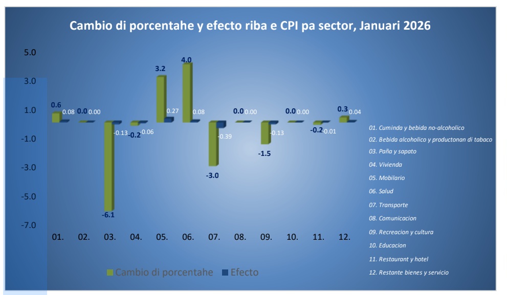 Recientemente, Oficina Central di Estadistica, CBS, a publica e Indice di Prijs di Consumo pa luna di Januari 2026. Den esaki, a nota cu 5 di 12 sector a registra caida di prijs.