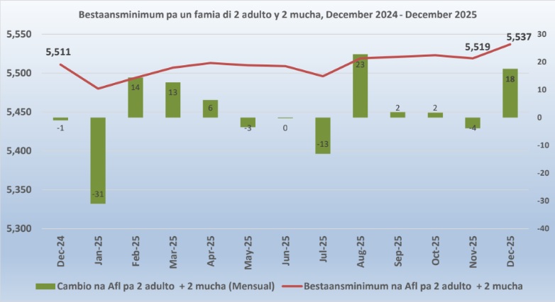 E bestaansminimum pa un hogar consistiendo di dos (2) adulto y dos (2) mucha (edad 0-14) na December 2025 ta Afl. 5,537, un subida di Afl. 18 compara cu November 2025 (Afl. 5,519). E bestaansminimum pa un hogar di un (1) adulto ta Afl. 2,636, un subida di Afl. 8 compara cu November 2025 (Afl. 2,628).