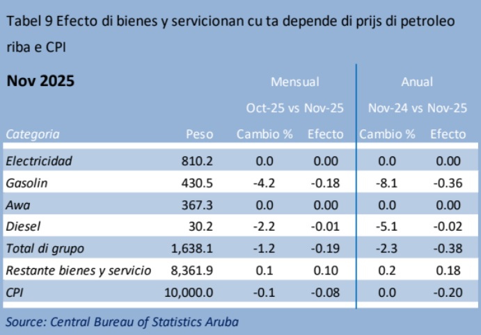 Prijs di gasolin a registra un caida di Afl. 9.50 cen (-4.2%) na November 2025 y tabatin un efecto di -0.18 ppt riba e CPI. Prijs di diesel a registra un caida di Afl. 4.40 cen (-2.2%) na November 2025 y a causa un efecto di -0.01 ppt riba e CPI. Na November 2025, utilidad, gasolin y diesel como grupo, tabatin un caida den prijs di 1.2% compara cu October 2025 y hunto tabatin un influencia di -0.19 ppt riba e CPI, mientras cu e restante 404 bienes y servicio hunto, a conoce un subida di prijs di 0.1% y tabatin un efecto di 0.10 ppt riba e CPI.
