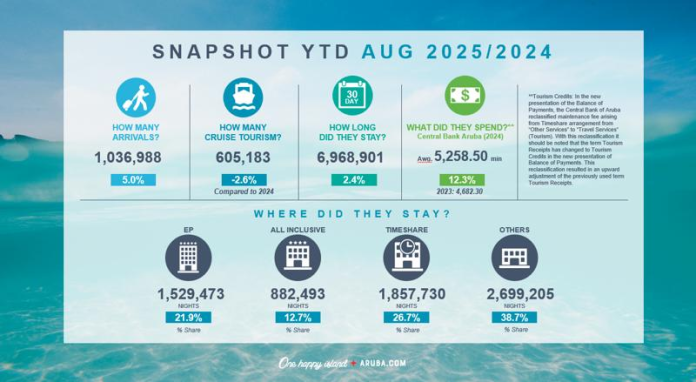 Den e mesun categoria di ‘stayover’, manera menciona Aruba a ricibi un total di 132.728 turista ‘stayover’, cual a representa un crecemento di 5.3% compara cu augustus di 2024, traduci na un aumento absoluto di 6,670 bishitante, cu e aumento mas notable di Latino America. Den e mesun categoria aki, Corsou a mira un aumento di 4% cu mas di 60.000 yegada den augustus, esaki ta duna e bista cu te ainda Aruba su crecemento turistico, por lo menos den e categoria aki, ta sigui riba un bon caminda.