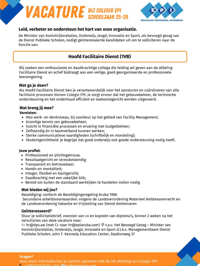 Home VACATURA Educacion Profesional Intermedio (EPI) – Hoofd Facilitaire Dienst (1VB) VACATURA Educacion Profesional Intermedio (EPI) – Hoofd Facilitaire Dienst (1VB) November 11, 2025 4 Facebook Twitter Google+ Pinterest WhatsApp Ultimo Noticianan Educacion Profesional Intermedio (EPI) – Hoofd Facilitaire... November 11, 2025 Petro a defende su mes contra esnan... November 11, 2025 Fundacion Contra Violencia Relacional (FCVR): “Aruba ta... November 11, 2025