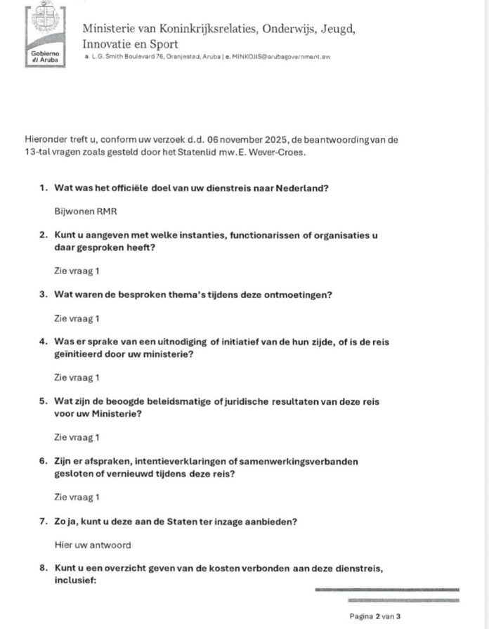 Un disputa politico riba transparencia y responsabilisacion a bolbe surgi despues di e publicacion di contestanan oficial di Minister di Relacion den Reino, Enseñansa, Hubentud, Innovacion y Deporte, Gerlien Croes, tocante un bishita di trabou na Hulanda.