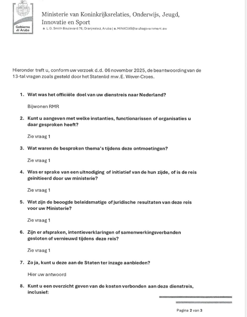 Di acuerdo cu e contesta oficial emiti solamente e prome pregunta, tocante e proposito di e biahe, a ser contesta directamente. E minister a declara cu e bishita tabata pa atende un reunion di Rijksministerraad, Conseho di Minister di Reino. Pa algun di e preguntanan, e contesta a referi ripitidamente back na e prome contesta, usando e frase “wak pregunta 1,” sin duna ningun detaye adicional, mientras cu otro preguntanan a keda sin informacion (NVT), y otronan ta referi na “dienstreisverslag” como medio di informacion.