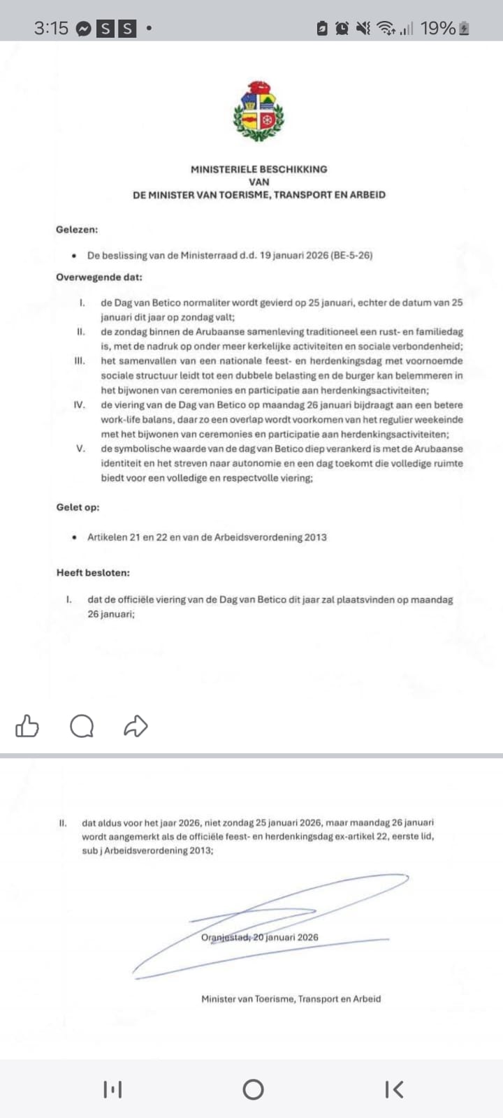 A tuma e decision pasobra dia 25 di januari, dia cu ta celebra Dia di Betico normalmente, ta cay riba un diadomingo na 2026. Esaki pasobra segun e decreto, “Celebra Dia di Betico riba dialuna 26 di januari ta contribui na un miho balans trabao-bida personal, ya cu esaki ta evita di cay hunto cu e weekend regular, mientras ta permiti atendencia na ceremonianan y participacion den actividadnan conmemorativo,” ta continua splica. “E balor simbolico di Dia di Betico tin raiz profundo den identidad Arubano y den e lucha pa autonomia, y e dia merece henter e espacio pa un celebracion completo y respetuoso.”