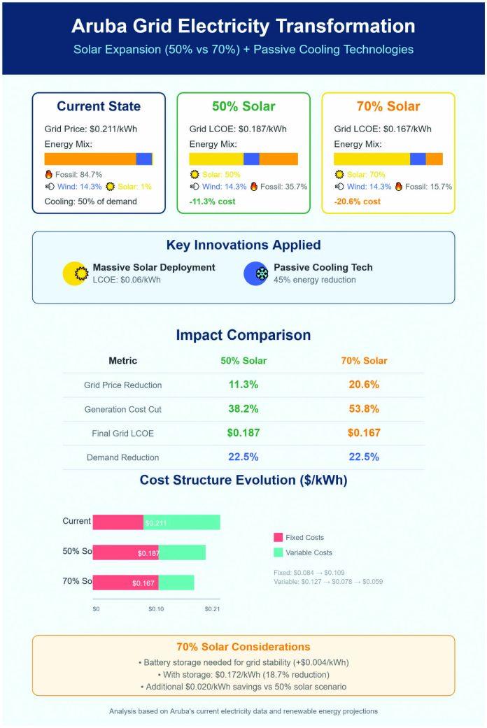 Usando un penetracion di 70% panel solar na un LCOE di 6,- US cen per kWh, combina cu un reduccion den uso di coriente danki na friamento pasivo cual lo reduci consumo total di electricidad di Aruba cu mas o menos 22%, tumando si na cuenta tur e inversionnan grandi cu mester tuma luga na Aruba su grid y battery storage, lo resulta den un prijs di coriente 24% mas barata compara cu e prijs di coriente actual.