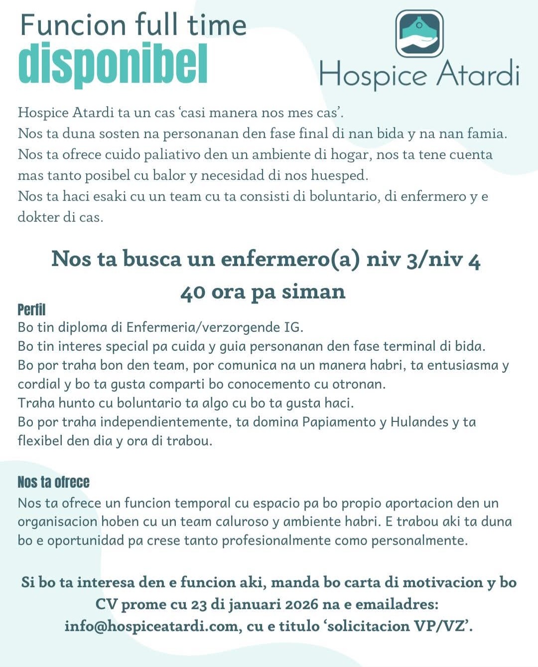 Home VACATURA Hospice Atardi – Enfermero(a) Niv 3/Niv 4 Full Time VACATURA Hospice Atardi – Enfermero(a) Niv 3/Niv 4 Full Time January 22, 2026 3 Facebook Twitter Google+ Pinterest WhatsApp Ultimo Noticianan Bucuti & Tara Beach Resort – Engineering... January 22, 2026 Hospice Atardi – Enfermero(a) Niv 3/Niv 4... January 22, 2026 Minister Gerlien Croes ta anuncia restructuracion di... January 21, 2026