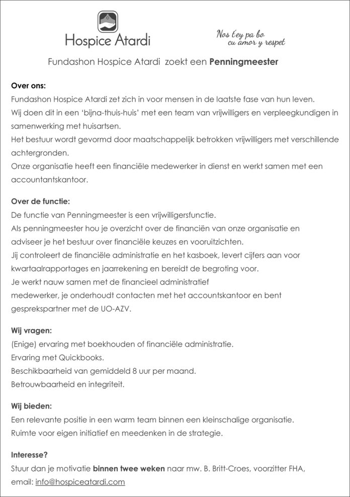 Home VACATURA Hospice Atardi – Penningmeester VACATURA Hospice Atardi – Penningmeester March 23, 2026 4 Facebook Twitter Google+ Pinterest WhatsApp Ultimo Noticianan Hospice Atardi – Penningmeester March 23, 2026 Bucuti & Tara Beach Resort – Houseman... March 23, 2026 Alhambra Casino & Shops – Various Job... March 22, 2026