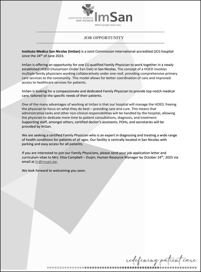 Home VACATURA Instituto Medico San Nicolas (ImSan) – Doktersassistent m/v VACATURA Instituto Medico San Nicolas (ImSan) – Doktersassistent m/v October 14, 2025 10 Facebook Twitter Google+ Pinterest WhatsApp Ultimo Noticianan Sheinbaum triplica envio di azeta Mexicano pa... October 14, 2025 Economia di Hulanda ta spera di crece... October 14, 2025 Parlamentario Xiomara Maduro (MEP): Gobierno ta sigui... October 14, 2025