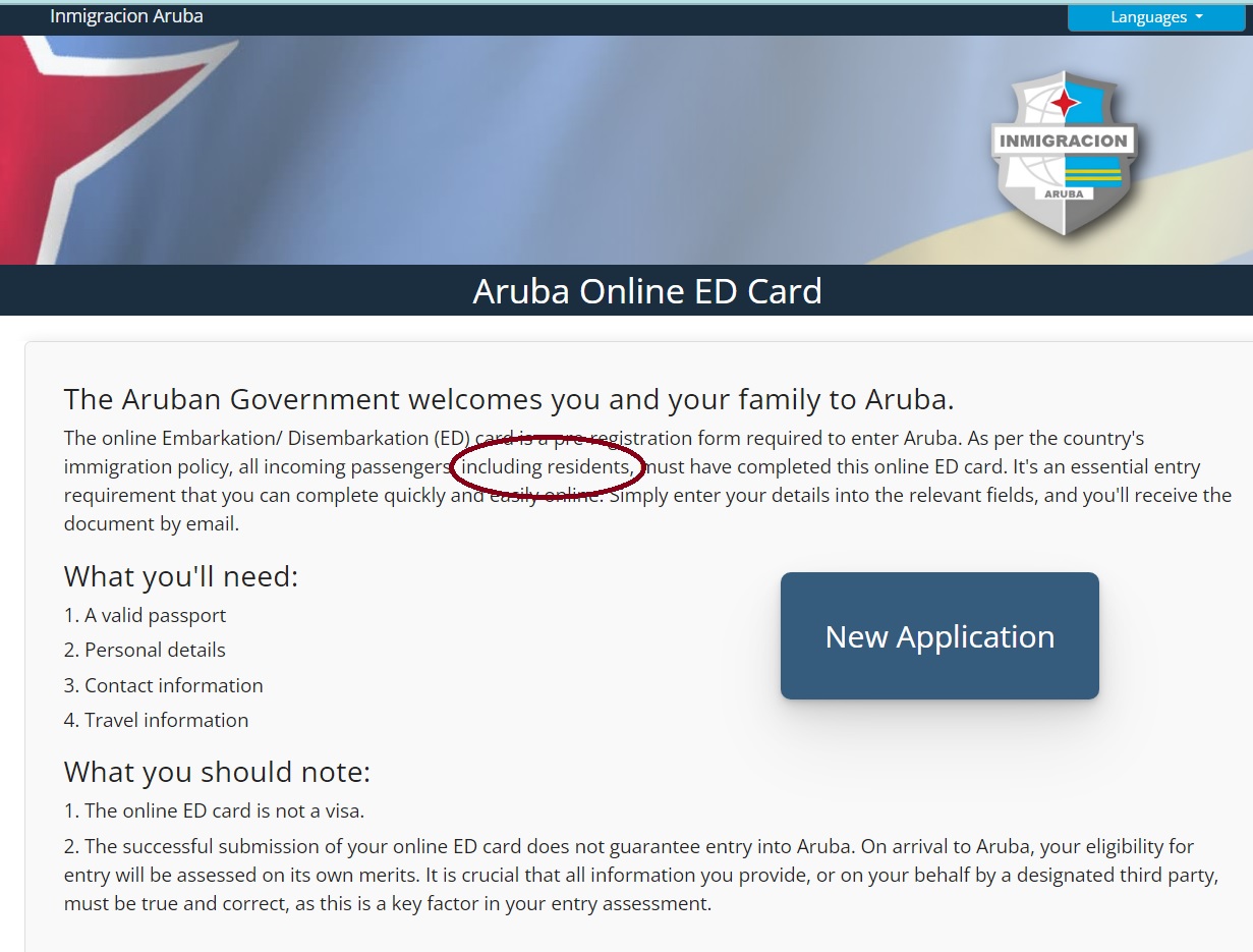 Segun e website oficial, edcardaruba.aw, e carchi di Embarcacion/Desembarcacion (ED) online ta un formulario di pre-registracion rekeri pa drenta Aruba. Segun politica di inmigracion di e pais, tur pasahero di yegada, incluyendo residente, mester a completa e ED-card online aki. E ta un rekisito esencial cu por completa “rapido y facilmente online.” Mester simplemente yena e detayenan y lo ricibi e documento via e-mail.