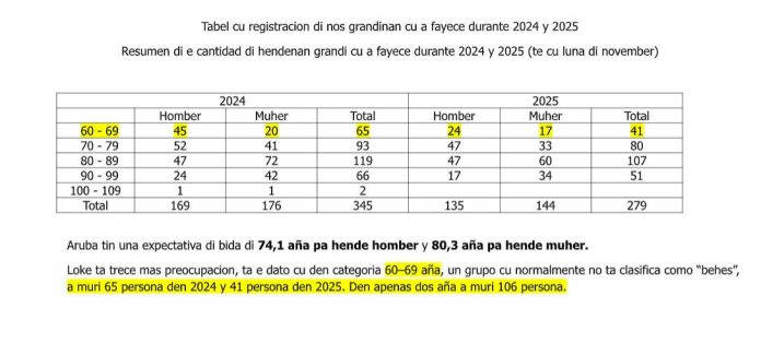 Durante e periodo di 2024 te cu november 2025, Aruba a perde un total di 624 adulto mayor. Solamente den 2024 a muri 345 persona riba edad avansa y den 2025, te cu awor, a muri 279. Esaki ta cifra cu tin peso pa un isla chikito manera Aruba.