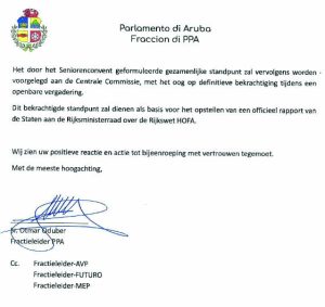 Finalmente Otmar Oduber kier enfatisa cu e carta di fraccion di PPA ta manda un apelacion categorico: stop cu division y politica barata. Aruba mester sigui un via di union, logra consenso den un Seniorenconvent y asina manda un mensahe fuerte y cla pa Hulanda: sin consenso, no tin Rijkswet. Otmar Oduber a recorda cu: “Nos grandinan a lucha pa gana Status Aparte. Awe nos responsabilidad ta defende esey cu unidad. Aruba no por perde su autonomia pa conveniencia of division partidista.”