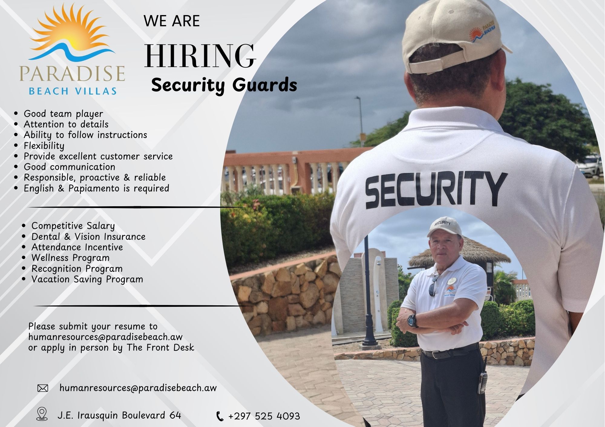 Home VACATURA Paradise Beach Villas – Security Guards VACATURA Paradise Beach Villas – Security Guards February 6, 2026 3 Facebook Twitter Google+ Pinterest WhatsApp Ultimo Noticianan OM ta exigi 30 luna prison den... February 6, 2026 Turistanan birando victima di practicanan cuestionable di... February 6, 2026 Adulto mayor Hulandes ta keda e blanco... February 6, 2026