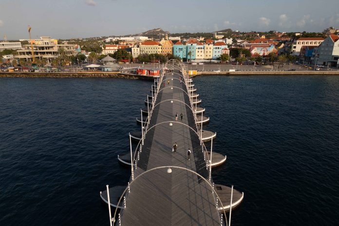 In this aerial view, people walk on the floating Queen Emma Bridge connecting the two neighborhoods of Willemstad (Punda and Otrobanda) across Sint Anna Bay, Curacao, in the Dutch Caribbean, on March 15, 2024.  (Photo by Federico PARRA / AFP)
