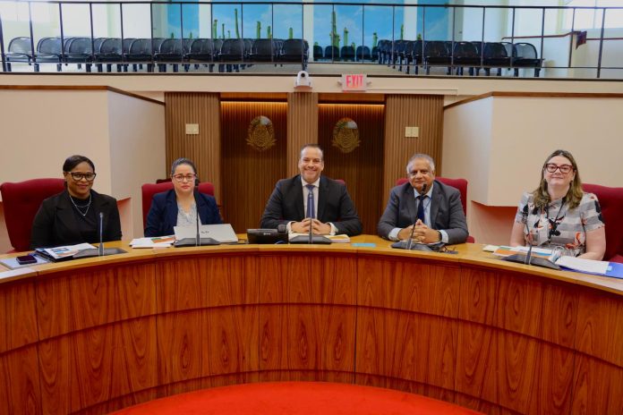 Minister di Finanzas, Asunto Economico y Sector Primario, mr. Geoffrey Wever, hunto cu Banco Central di Aruba (CBA), a duna presentacion na comision parlamentario CFOCS (Commissie Financiën, Overheidsorganisatie, Cultuur en Sport) tocante e avancenan den e implementacion di e Landsverordening regeling consumentenkrediet.