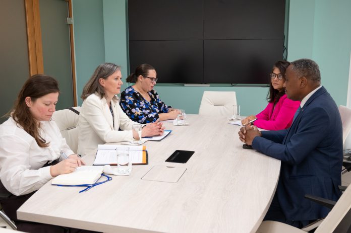 Sra. Lise Gregoire-van Haaren, Representante Permanente (apunta) di Reino Hulandes na Nacionnan Uni na New York, a haci un bishita di introduccion na Minister di Husticia, Integracion, Transporte Publico y Energia, mr. drs. Arthur Dowers (AVP).