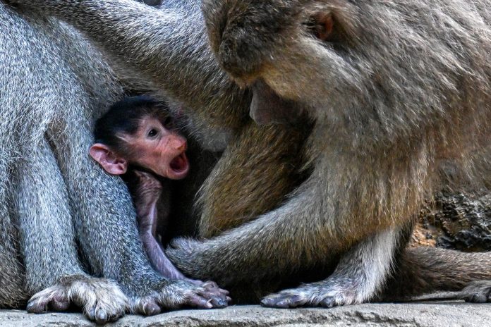A three week-old Baboon (Papio hamadryas) and its family are pictured at their enclosure at the zoo in Cali, Colombia on April 4, 2025. (Photo by JOAQUIN SARMIENTO / AFP)