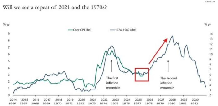 E siguiente grafico di banco di private equity Apollo, ta mustra cu e patronchi di inflacion ta casi precies mesun cos cu añanan 1970 pa 1980. E ta mustra sumamente duidelijk cu e prome aumento di inflacion, esta durante e periodo di COVID, siguramente no ta e delaster “montaña di inflacion”, y cu nos por spera inflacion hopi mas halto den añanan 2026 y 2027.
