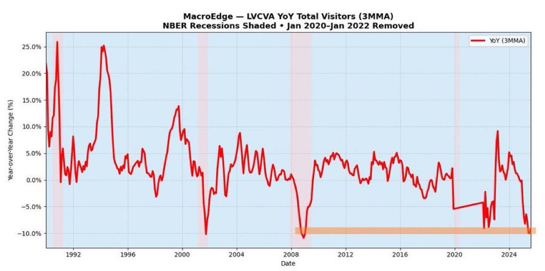 Awo na Aruba, nos ultra-kader finalmente a cuminsa admiti e realidad un poco, pero si nos wak data di turismo di ciudad Las Vegas, cu por wordo usa mas o menos como proxy pa turismo di Nort America en general, nos ta wak cu esaki ta den un freefall absoluto, cu ta yegando e nivel mas abao desde crisis financiero di 2008. Un otro señal cu temponan mas dificil economico lo por wordo spera na Aruba.