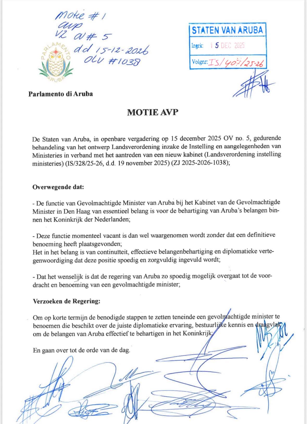 Den su mocion ayera, fraccion AVP a bisa cu “e posicion di Minister Plenipotenciario di Aruba na Den Haag ta di importancia esencial pa salvaguardia interesnan di Aruba dentro di Reino Hulandes.” Ademas, a reconoce cu actualmente e posicion ta yena a base interino sin un nombramento definitivo, pero ta importante pa haci un nombramento pronto “den interes di continuidad, representacion efectivo di interes y representacion diplomatico.”